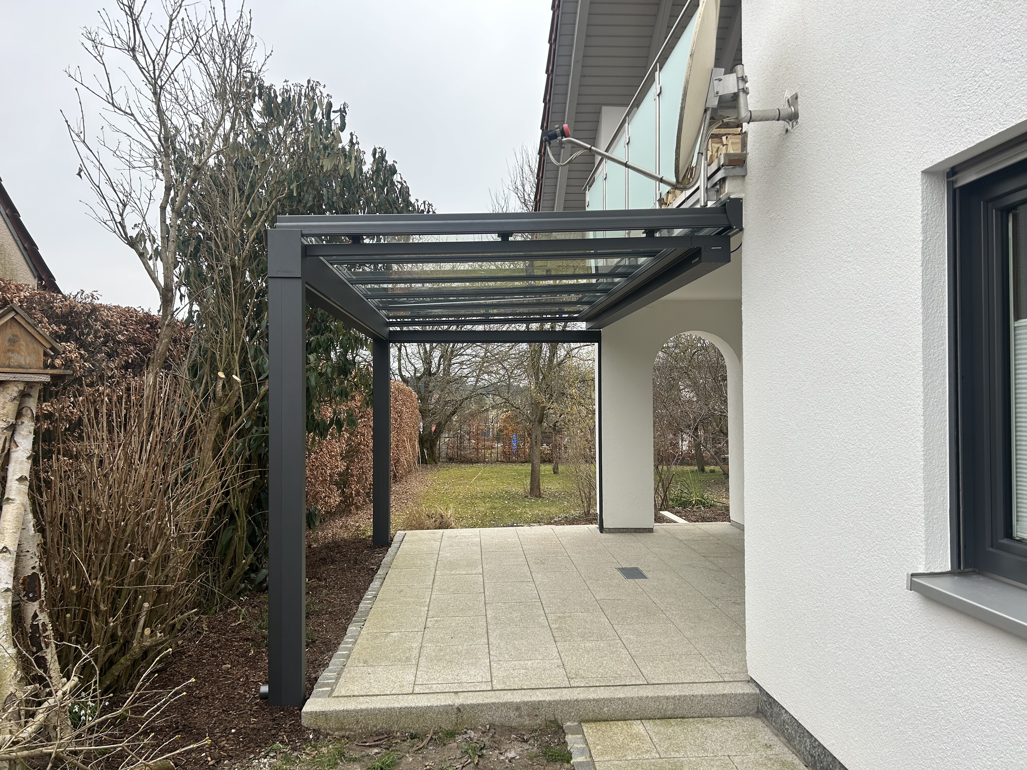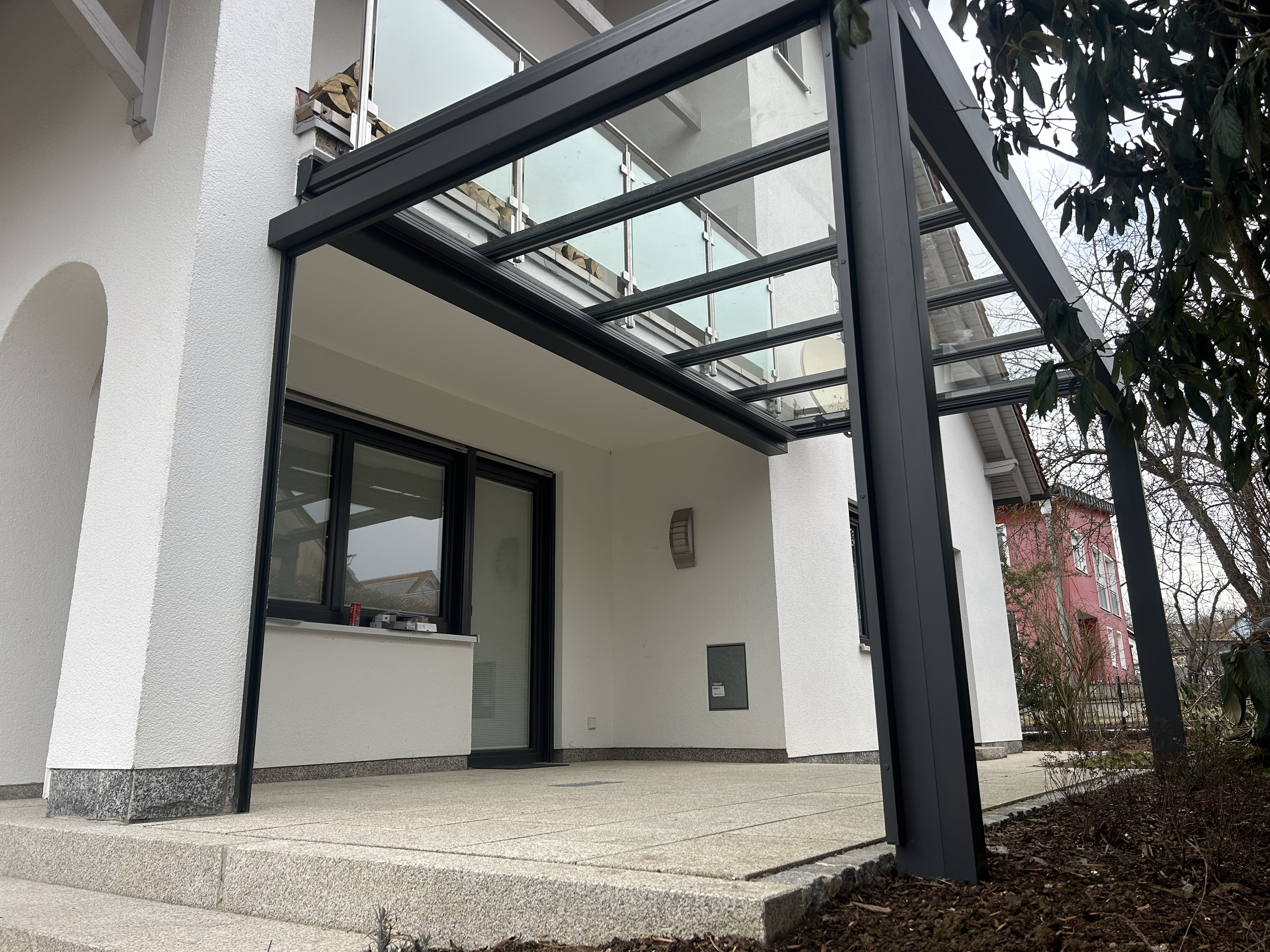 Für dieses Projekt kam das System Avantgarde A300 von Terrasign zum Einsatz, gefertigt aus hochwertigem Aluminium in DB 703 Eisenglimmer. Die robuste Überdachung fügt sich harmonisch in die bestehende Architektur ein und sorgt mit ihrem eleganten Look für eine stilvolle Note. Ergänzt wird das Ganze durch die integrierte Unterglasmarkise unseres Premiumpartners Warema, die zuverlässigen Sonnenschutz bietet, ohne die freie Sicht zu beeinträchtigen.