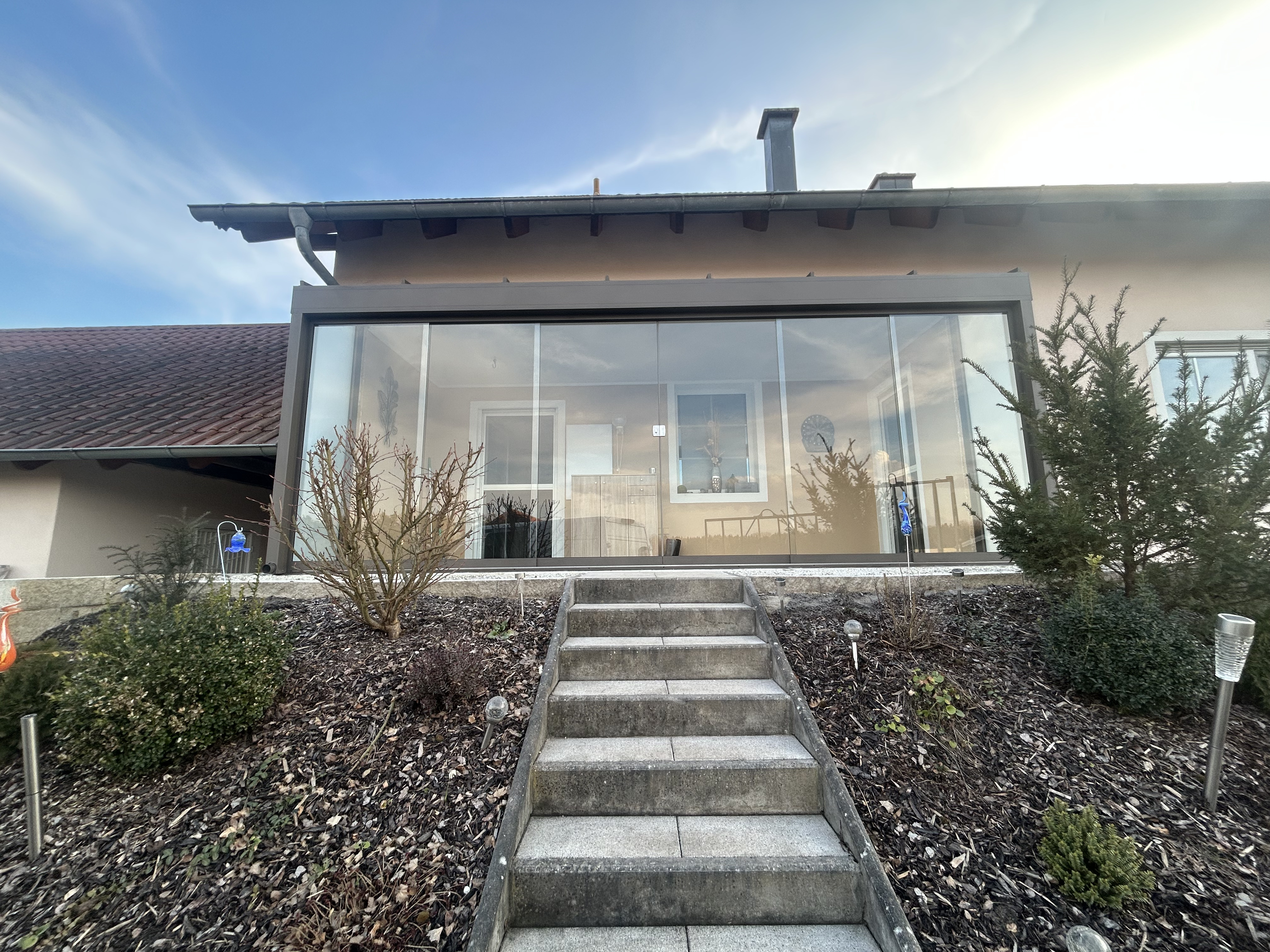 Für dieses Projekt kam das System Avantgarde A300 von Terrasign zum Einsatz. Das edle Aluminium in Marone 04 harmoniert perfekt mit der modernen Architektur des Hauses. Die robuste Überdachung in Verbindung mit den flexiblen Glaselementen schafft einen geschützten Outdoor-Bereich, der das ganze Jahr über genutzt werden kann. Ob zum Essen, Entspannen oder Feiern – Sie profitieren jederzeit von einer angenehmen und stilvollen Atmosphäre.