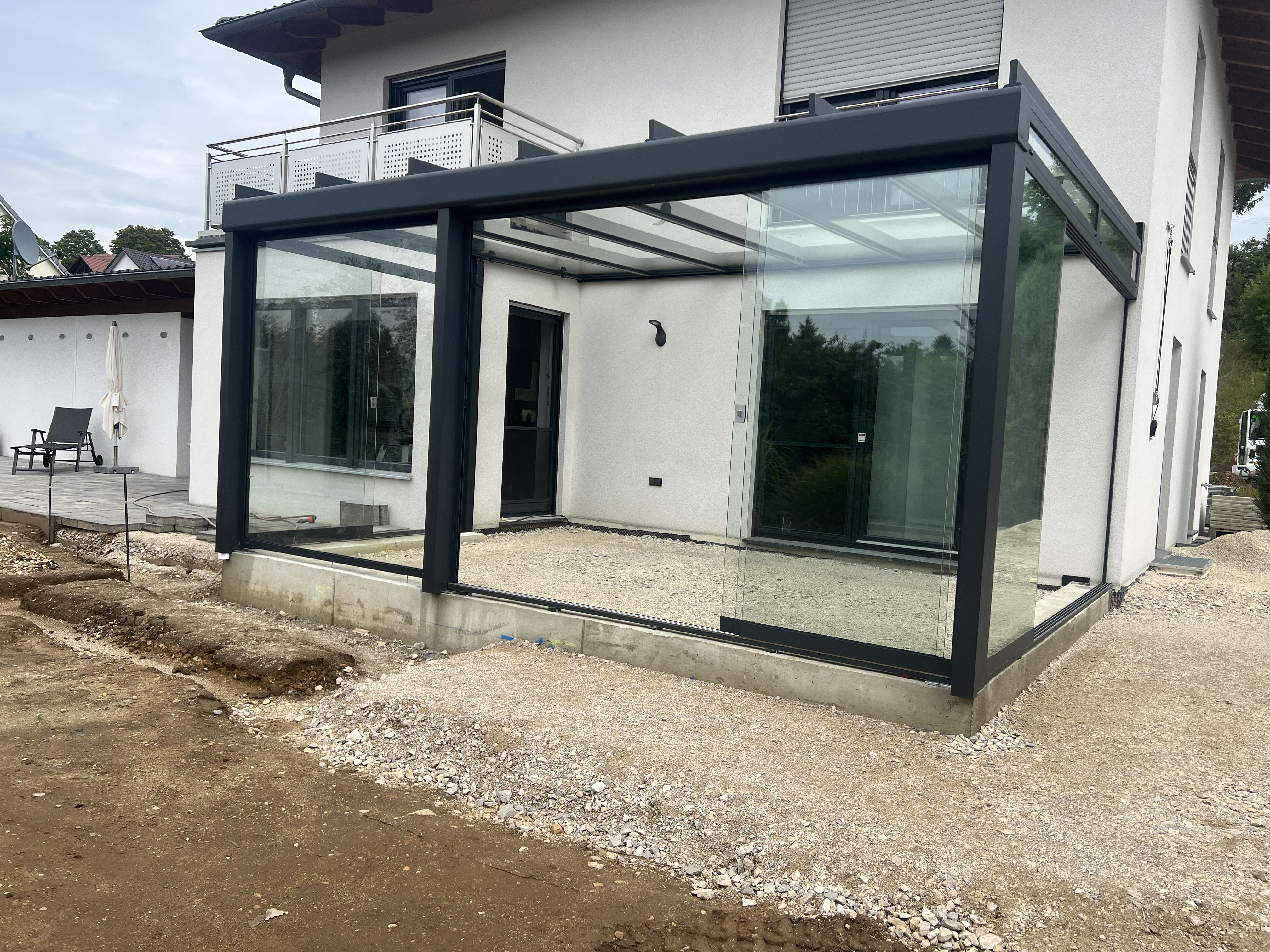 Für unseren privaten Bauherrn in Ensdorf haben wir eine hochwertige Terrassenüberdachung Avantgarde A 600 von Terrasign realisiert – eine robuste, pulverbeschichtete Aluminiumkonstruktion in RAL 7016 Anthrazitgrau, die sich elegant in die Hausarchitektur einfügt.