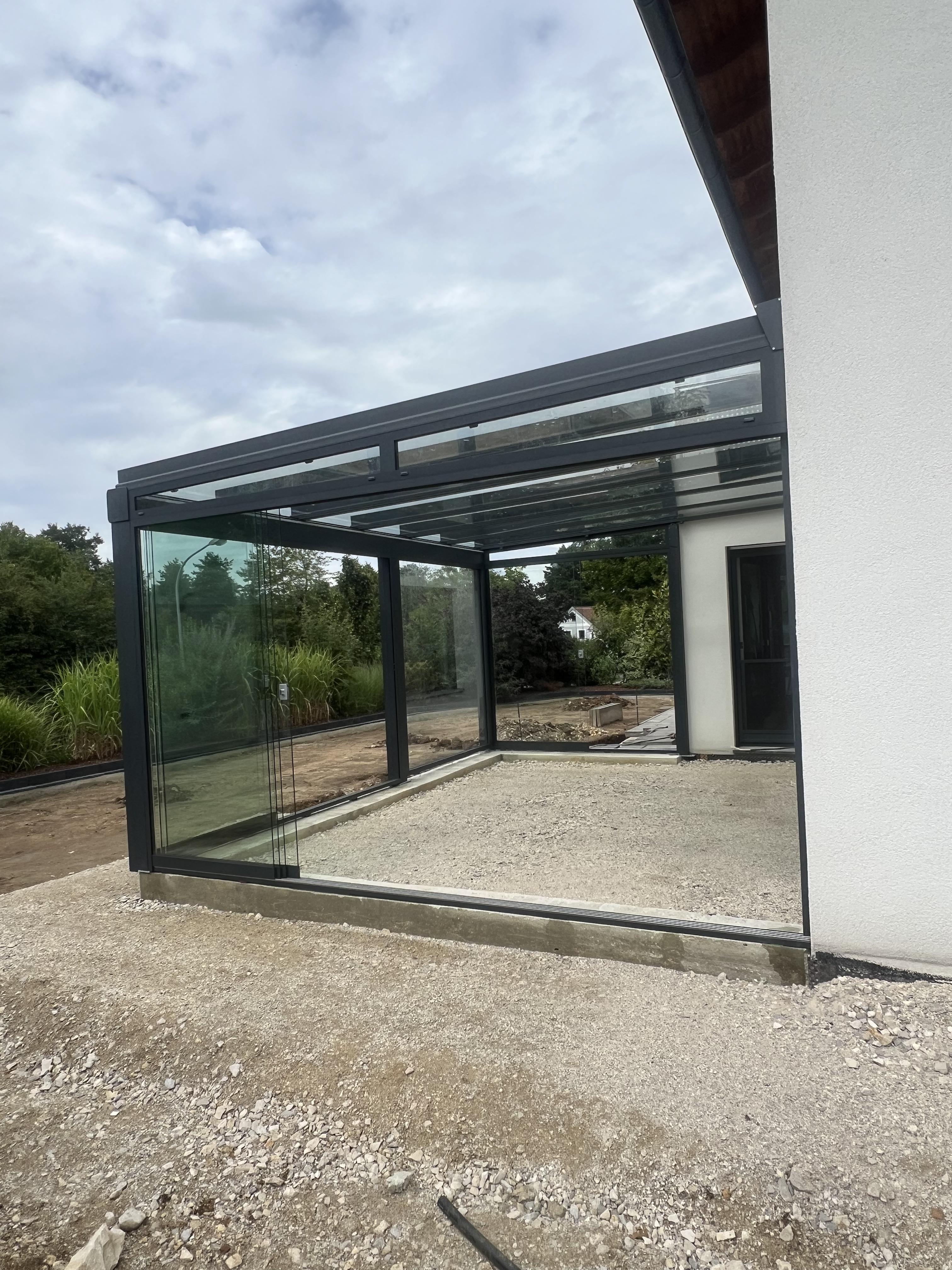 Die ergänzende Senkrechtverglasung (Ganzglas-Schiebeelemente) bietet verlässlichen Wind- und Wetterschutz, ohne die Sicht zu begrenzen. Dank der schlanken Profile, der leisen Laufwagen und schwellenarmen Übergänge lassen sich die Elemente komfortabel öffnen oder schließen – je nach Wetterlage und gewünschter Offenheit. Sicherheitsglas und korrosionsbeständige Materialien sichern eine dauerhaft schöne Optik und lange Lebensdauer. Das Ergebnis: eine echte Wohnraumerweiterung, die Design, Funktion und Wohlfühlklima perfekt vereint.